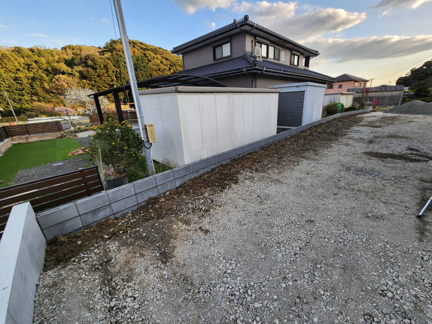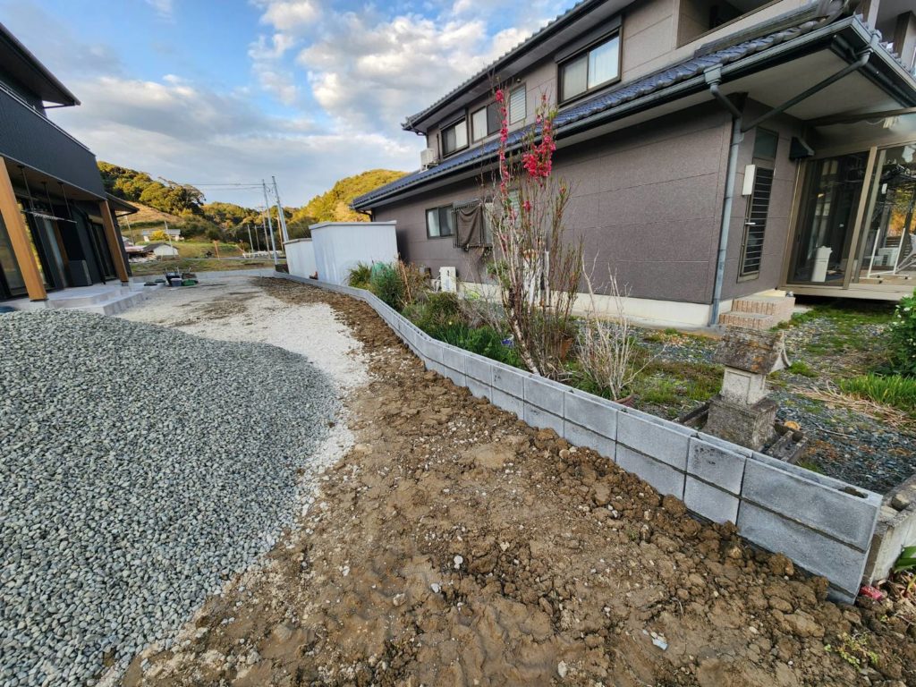 ブロックの施工が終わり埋め戻しをして、5号砕石を大型ダンプで現場に運んで頂き、子運搬で砂利を敷いていきます👷‍♂️